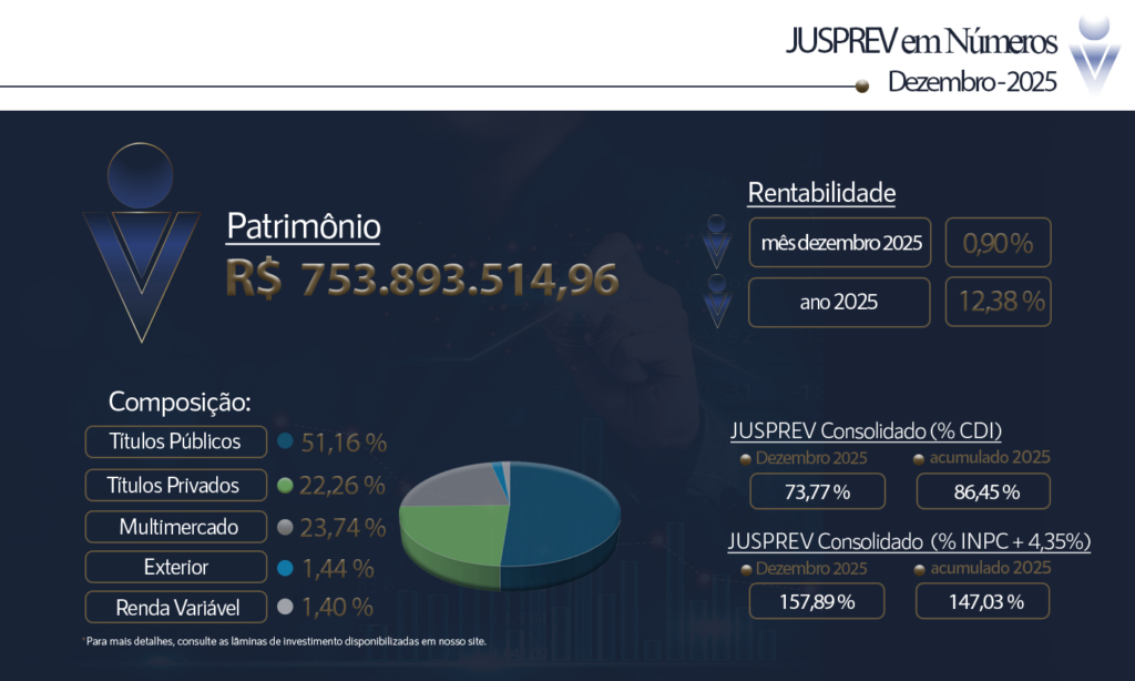 Prezando sempre pela transparência nas informações, a JUSPREV divulga mensalmente para seus participantes e assistidos os números referentes à rentabilidade do PLANJUS. A entidade ressalta que, em sua carteira de investimentos, é conservadora, prezando pela segurança do patrimônio de seus participantes. As estratégias da carteira passam sempre pela análise do Comitê de Investimentos, formado por participantes da JUSPREV, e pela consultoria em investimentos Aditus.